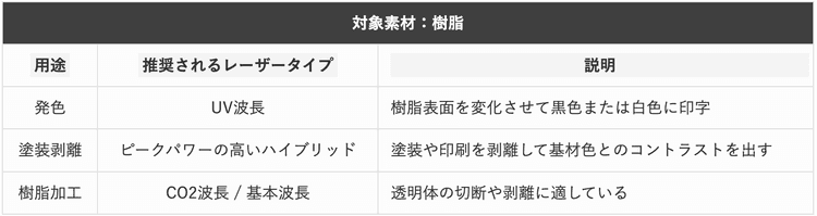 例えば、樹脂に対してはUVレーザーが、金属にはファイバーレーザーが適していることがあります。