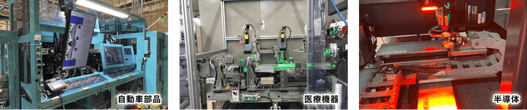 自動車・電子機器・医療機器・半導体・液晶・医薬品・食品・化粧品・金属部品・樹脂成形品など多数。