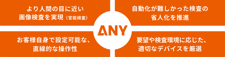 学習を重ねることで進化し、自ら判断を下しながら高精度な画像検査を実現するANYディープラーニングパッケージ。厳選したシステム構成と、お客様自身でのティーチングを可能としたわかりやすいインターフェースにより、多種多様な画像検査のご要望にお応えします。
