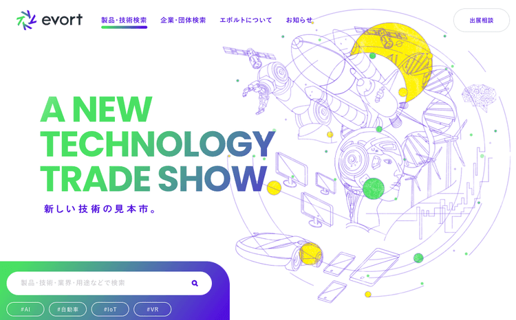 株式会社エボルトは、あたらしい技術を世に広めることで社会の進化を促すことを目指し、オンライン展示会「新しい技術の見本市 evort(エボルト)」を運営しています。出会うべき人と人、技術と技術を結びつけ、ビジネスに進化を生み出すために「見本市」そのものを進化させていきます。