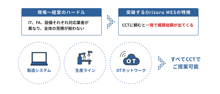 CCTは、ITシステムとしてOrizuru MESの構築、FAのためのOTネットワーク構築や制御の仕組み構築・改修、設備の改造・導入まで一気通貫でのご対応が可能です。
