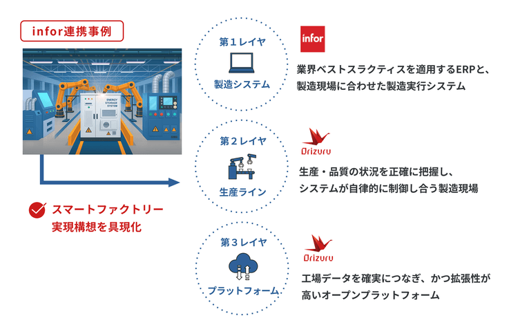 工場システム(ERP/MES/FA)の構築を、CCTが一気通貫で支援し、Orizuru MES × Infor CSI連携により、OT(現場技術)とIT(システム)を融合した製造実行システムを実現しました。
