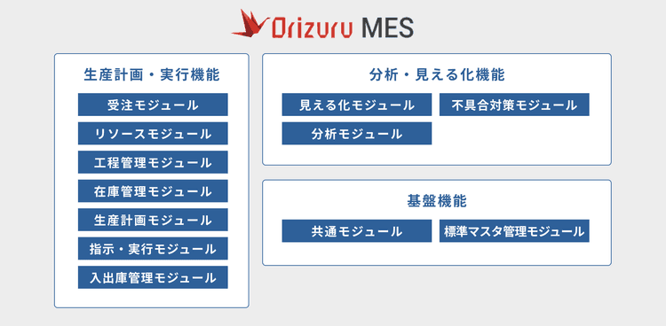 Orizuru MESのパッケージ全体像は「生産計画・実行機能」「分析・見える化機能」「基盤機能」から構成されています。
