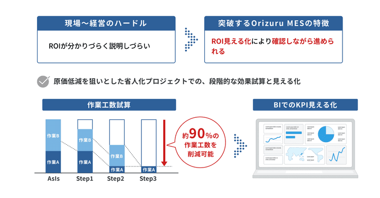 Orizuru MESは、段階的な効果試算やBIツールによるKPI(重要指標)の可視化を通じて、ROIを「見える化」できるのが特徴です。