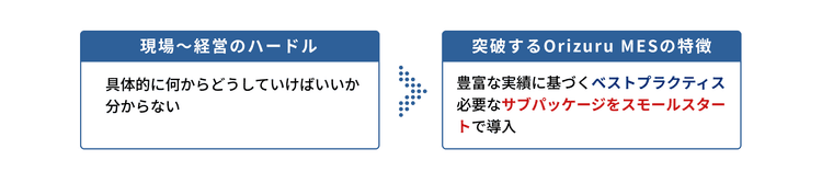 Orizuru MESは、製造現場の課題に対し「どこから手を付ければよいかわからない」という悩みに対して、豊富な実績に基づくベストプラクティスと必要な機能をパッケージ化しました。