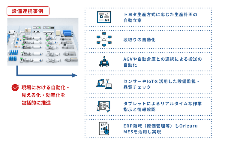 Orizuru MESの導入により、トヨタ生産方式に応じた生産計画の自動立案、段取り作業の最適化、AGVや自動倉庫との連携による搬送の自動化、センサーやIoTを活用した設備監視・品質チェック、さらにタブレットによるリアルタイムな作業指示と情報確認を実現し、現場における自動化・見える化・効率化を包括的に推進しました。