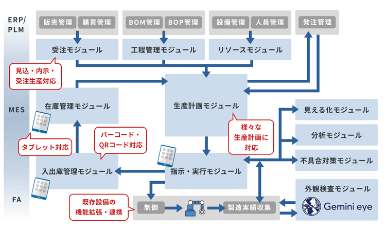 Orizuru MESは上位システム(ERP、PLMなど)と下位システム(FA、生産設備)をつなぎ、工場全体のDXを実現する設計になっています。