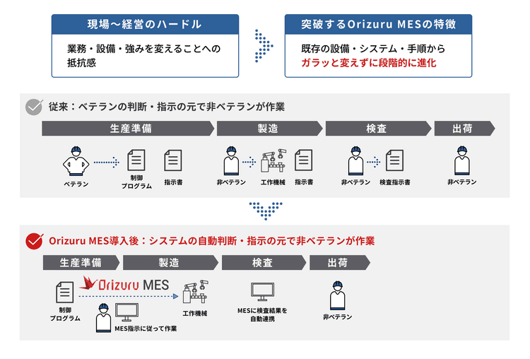 Orizuru MESは製造業を対象とし、現状の現場の仕組みを活かしつつ、生産性や品質の向上、属人性の解消といったあるべき姿を実現し、生産キャパシティの最大化、原価低減などの経営目標を達成するためのソリューションです。