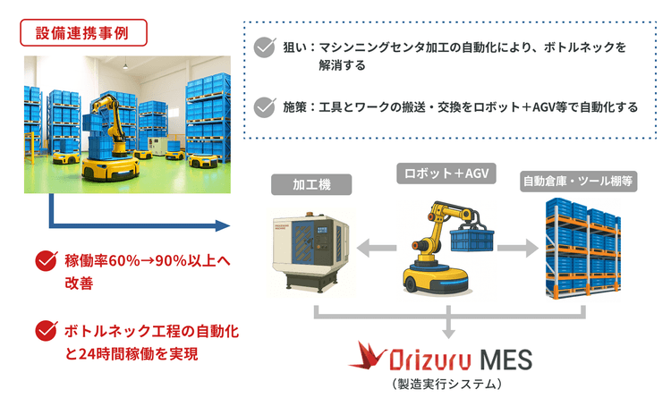 そこで生産計画立案~加工指示・実績収集までの工程全体の最適化をOrizuru MESで実現し、稼働率60%→90%以上へ改善。ボトルネック工程の自動化と24時間稼働を実現しました。