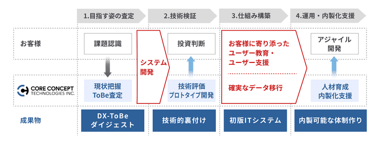 成果物はDX-ToBeダイジェストというドキュメントだけでなく、技術検証やシステム構築はもちろん、ナレッジ、プロセス、ツールや人材の提供など、「成果」と「仕組」が残る手法での進め方も特長です。