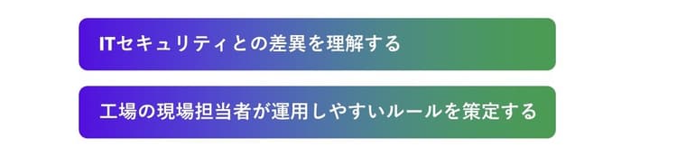 OTセキュリティ対策を運用していくのは製造現場の担当者です。そのため、生産活動と併用していくうえでセキュリティ対策の運用が負担となり過ぎないことが重要です。