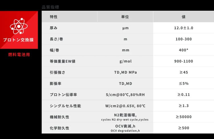 半透膜で、電子絶縁体や反応体バリアの役割を果たしながらプロトンを伝導するように設計されています。プロトン交換膜燃料電池(PEMFC)やプロトン交換膜電解の膜電極アセンブリー(MEA)に組み込まれ、酸素と水素の間での反応を促進します。