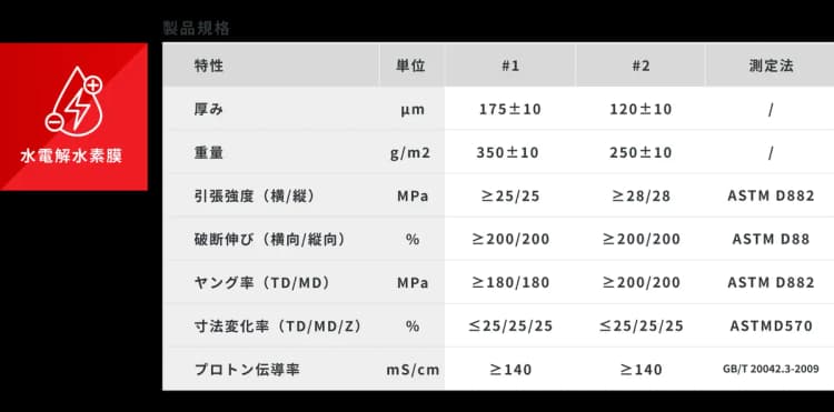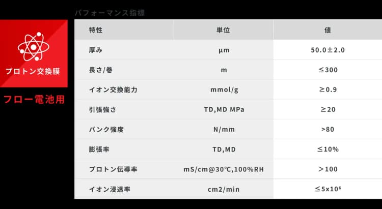 固体高分子電解質であり、イオン交換機能末端基を有するパーフルオロスルホン酸樹脂均質膜です。耐熱性、機械的特性、電気化学的特性、化学的安定性に優れ、過酷な条件下でも使用いただけます。
