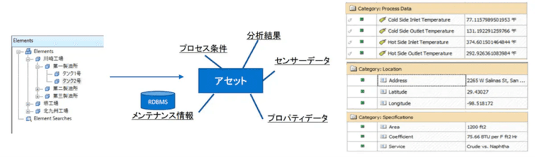 プラントや設備などの資産を「エレメント」として定義し、その要素に「属性」を設定することで、時系列データや設計データ、外部システムのデータなどを関連付けることができます。