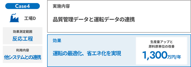 品質管理データと運転データの連携による運転の最適化しました。結果、生産量アップと原料原単位の改善につながり、年間約1,300万円の効果を実現しました。