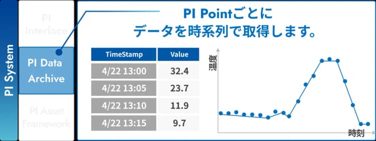 センサーが取得した時系列データは、PI Point単位で管理され、AVEVA社独自のデータアーカイブ技術により圧縮されてデータベースに格納されます。そのため、ITリソースの抑制が可能です。