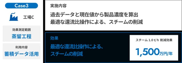 過去データと現在値から製品濃度を算出し、最適な還流比操作による、スチームの削減させる取り組みを行いました。結果、年間で約1,500万円のコスト削減効果を実現しました。