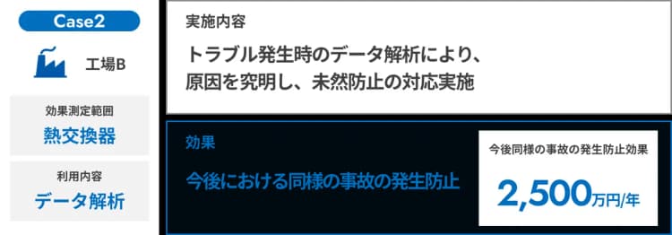 熱交換器においてトラブルが発生した際、データ解析を活用して原因を究明し、未然に防ぐ対応を実施しました。今後年間約2,500万円の損失をゼロに抑える効果を見込んでいます。