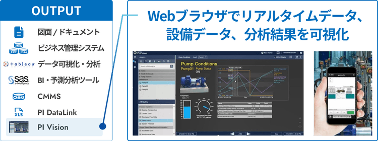 リアルタイムデータ、各種設備情報を紐づけ、設備に関連する情報を可視化することができます。これにより、場所を問わずデータにアクセスでき、業務の効率化に貢献します。
