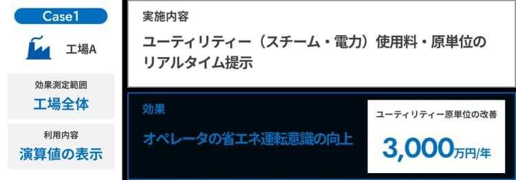 ユーティリティーの使用料と原単位をリアルタイムで提示することにより、オペレーターの省エネ運転意識を向上させる取り組みを行いました。結果、年間で約3,000万円のコスト削減効果を実現しました。