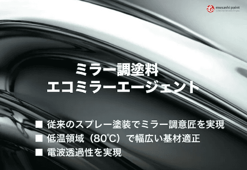 エコミラーエージェントは一般的なスプレー塗装設備で鏡面加工を行うことが可能なミラー調塗料となります。非常に高級感のあるミラー意匠が可能な上に電波透過性を有しており、様々な要望を満たす塗膜性能・作業性を兼ね備えた仕様となっております。