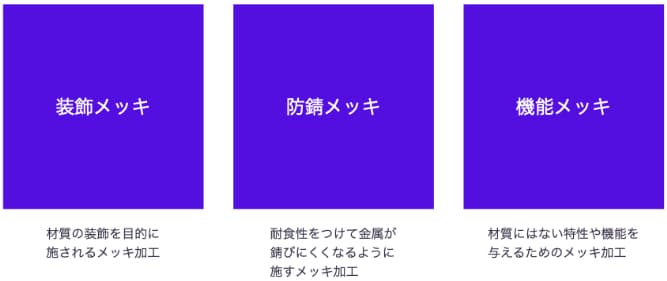 メッキ加工の方法は数多くの種類があります。ここでは代表的な加工種類として「装飾メッキ」「防錆メッキ」「機能メッキ」についてご紹介します。