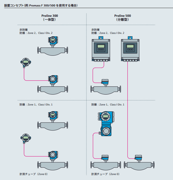 どのアプリケーションにおいても、Proline 300/500 流量 計システムをプラントに完全に統合することができ、多様 なデザイン、センサ、呼び口径、フィールドバス、設置オプションにより、お客様のプロセス条件に適合させることが可能です。