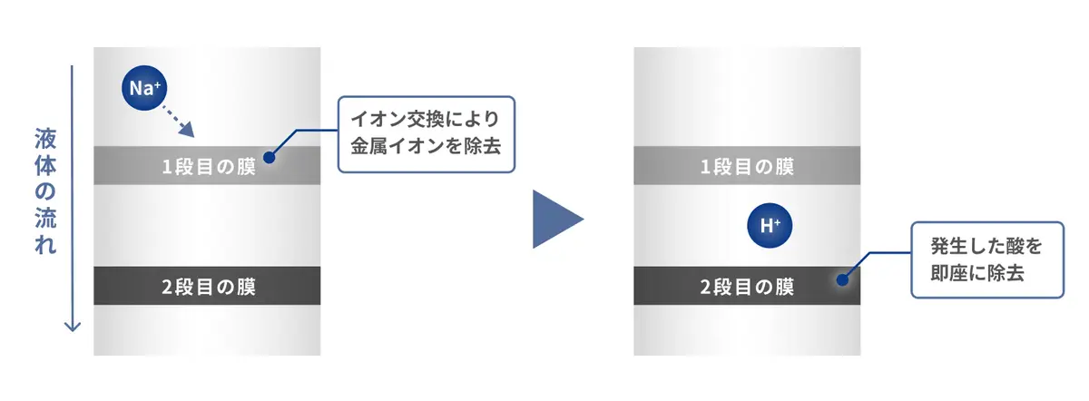1段目:イオン交換により金属イオン除去を行う膜