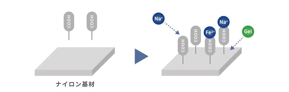 Nylon基膜にカルボキシル基を放射線グラフト重合で修飾。スルホン酸基を使わず、イオン交換を避けたタイプの金属除去メカニズムのため、酸を発生させません。