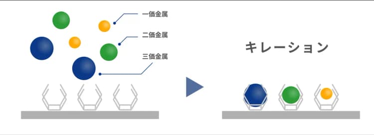 現在、一般的にはこのキレート構造による金属イオン除去が、イオン交換に代わる方法として用いられています。