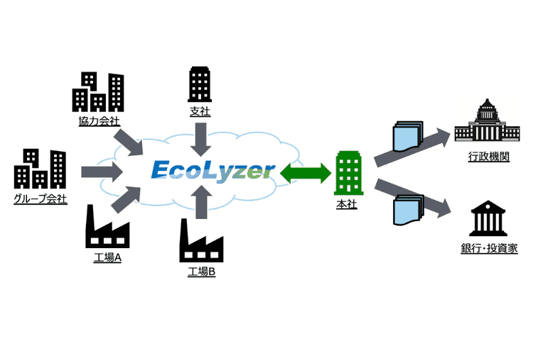 環境データ統合管理システム「EcoLyzer」は、全社のCO2排出量、エネルギー使用量、廃棄物処理量などの環境データを一括管理、分析するためのWebシステムです。多数の拠点から環境データを収集、そのデータを分析・集計し、その結果を文書として行政機関や銀行・投資家にご提供するために使用します。