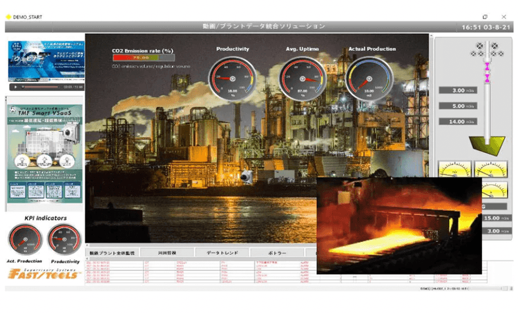 本ソリューションは、プラント内に散在する各種プラントデータ(温度、圧力、流量、回転数、振動数、設備稼働状態、制御設定値、プラント操業状態等)とカメラの動画やサーモカメラの映像をSCADA(Supervisory Control And Data Acquisition)システムで融合させ、同一画面に表示させることにより、工場内で起きている事象を一元可視化・集中監視化させるものです。