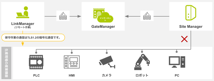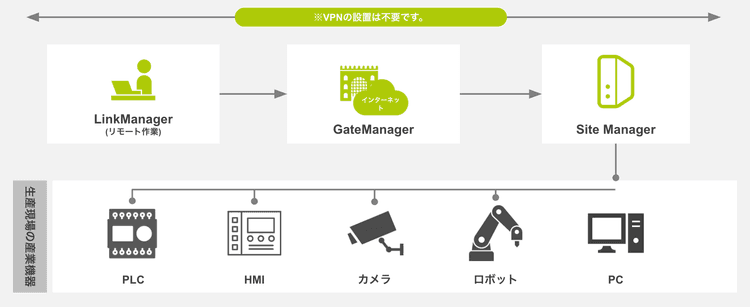 GateManagerは、SiteManager(サイトマネージャ)とLinkManager(リンクマネージャ)を接続する中継サーバです。GateManagerは全体を管理および監視し、セキュリティ面を強化します。通信の中継役を果たし、セキュリティ認証を行い、リモートアクセスのセキュアなトンネルを確立します。この中継サーバは、リモートアクセスのセキュリティと効率性を確保します。