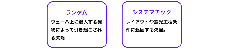 ウェーハの欠陥には主に「ランダム」と「システマチック」と呼ばれる2種類があります。ランダムな欠陥は主にウェーハ上に混入する異物によって引き起こされる不良であり、文字通り発生箇所はランダムとなり予測が困難です。そのため、ウェーハ上をX,Yの位置座標として把握することで欠陥の発生箇所を検知します。一方、システマチックの欠陥は、レイアウトや露光工程条件に起因する欠陥であり、転写された全ての回路パターンで同一箇所に発生する傾向があります。![]()