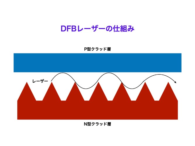 長距離の光通信には向いていないFBレーザーと比較して、DFBレーザーは単一の波長のみレーザー発振することが可能であるため、長距離かつ高速が求められる光通信に適しています。DFBレーザーの構造はN型クラッド層に「回折格子」と呼ばれるギザギザがあり、この回折格子に光が当たることで光みが増幅されます。この構造によって単一でのレーザー発振が可能となっています。