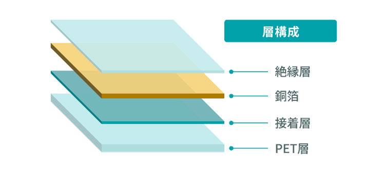 - PET層(厚さ 100μm/188μm) + 接着層 + 銅箔(厚さ 3μm/ 9μm/ 12μm/18μm) + 絶縁層