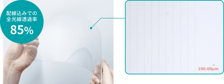 微細な配線を可能にすることで、配線込みでの透過率が格段にアップ。全光線透過率85%を実現しました。