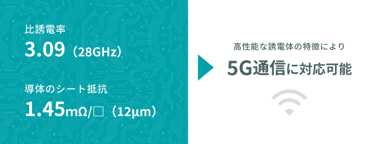 5G通信対応には誘電特性の優れた材料が必要です。透明アンテナ「SPET-SG」 は低誘電率・低誘電正接で5G通信に対応し、高速伝送に貢献。比誘電率3.09(28GHz)、シート抵抗が1.45mΩ/□(12μm)と⾼性能な誘電体の特徴があります。