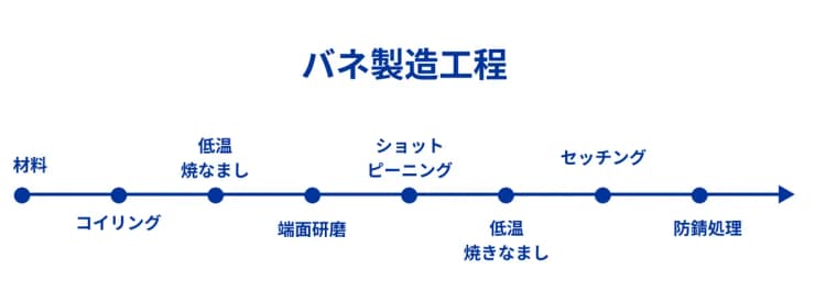 ショットピーニング後に再度行われ、バネの材質を安定させるために低温で加熱処理します。このステップは、バネの寿命を延ばすために重要です。