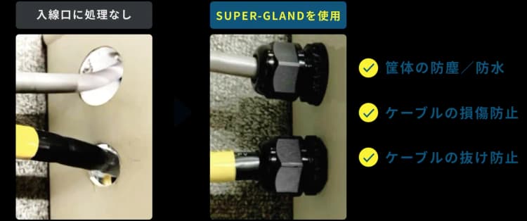 「スーパーグランド(SUPER-GLAND)」シリーズは、装置・機器類の筐体とケーブルの入線口に使う製品です。