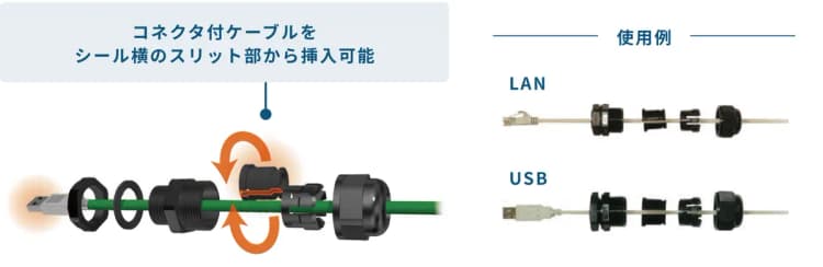 コネクタ付ケーブル用 | ![]() シール部にスリットがあるので、USBやRJ-45等コネクタ付きケーブルを分解することなくクランプできます。多芯型でも対応可能です。 |