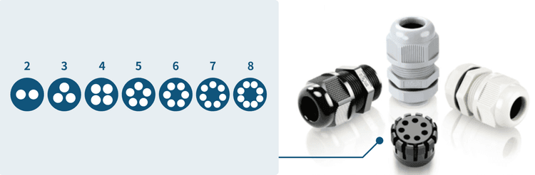 電線を複数本通せるタイプの製品です。カタログ標準品で2穴~8穴までラインナップしています。