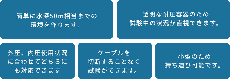 水中で使用する場合や高い防水性能を必要とする場合、またケーブルが特殊な場合など防水に不安がございましたら、「スーパーグランド(SUPER-GLAND)」シリーズとご使用されるケーブルの組合せで防水試験を実施しますので是非ご活用ください。防水検証と共に推奨トルク値・ギャップ値などをご案内させていただきます。ご使用環境は様々であり防水を保証するものではありませんが、実際に使用されるケーブルをお預かりすることで、より近い防水試験が実施できます。