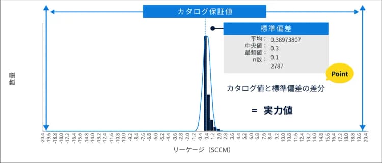 試験結果 | n数=2787という数に対して、リーク試験の測定結果は、実質4LPMとなり、大量生産にもかかわらず、カタログに記載されている公式のリーク量(20 LPM)に対して、均質であるかがわかります。また、カタログ値と標準偏差値の差分はまさに「要求実現値=要求実現度の高さ」を表しています。 |