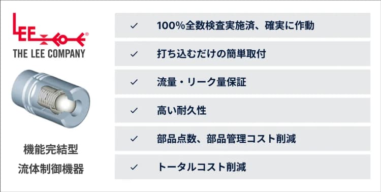 必要な作業は、「打ち込みのみ!」、短時間で取付が完了し、確実に機能し、より耐久性があり、トータルコストを削減する。LEEの「機能完結型」流体機器は、その高度な技術力と革新的な設計により、LEEデバイスを組み合わせるだけで回路を構成できます。この革新的なアイディアは、お客様にコスト効率と機能性の両立を提供します。