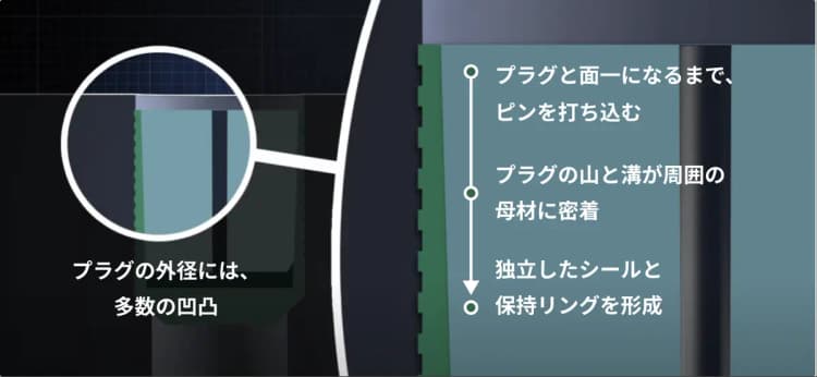 Locking Endの原理 | プラグの外径には多くの凹凸があり、ピンがプラグに打ち込まれると、制御された膨張により、プラグの凹凸が周囲の母材に密着し、多層シールリングを形成します。 これにより、液体・気体問わず、確実で信頼性が高く、漏れやトラブルのない高信頼シール面を形成するする革新的な技術です。 |