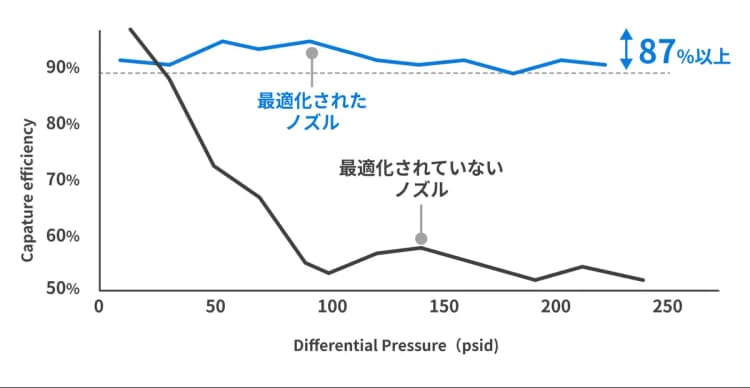 ※潤滑ノズルの差圧に対するキャプチャ効率を比較
