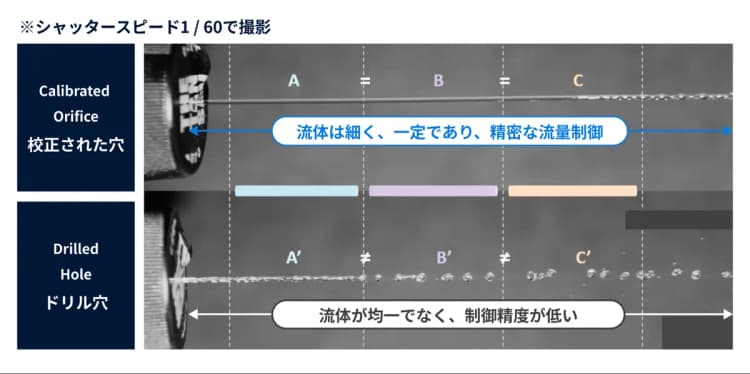 ※シャッタースピード1/60秒で捕捉したLEEの精密オリフィスと、通常のドリル穴から出る流体の状態を比較