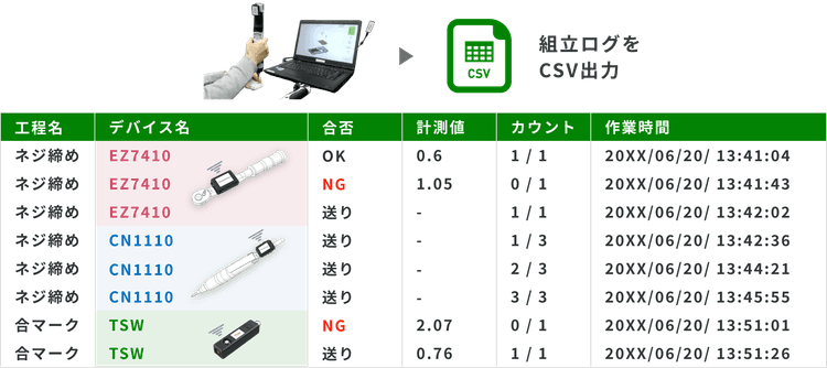 作業や測定結果のログを自動で記録することができます。タイムスタンプ付きで工程ごとの結果を保存するため、トレーサビリティ確保に最適です。ログはCSV形式で出力することが可能です。