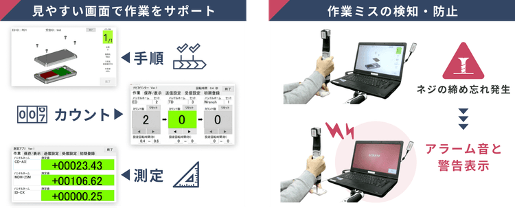 当社提供の作業ナビゲーションアプリをご利用いただくことで、組み立てミスやネジの締め忘れを防止できます。作業手順の表示により、順番を間違えることなく作業できるようサポート。工具選定の間違いやネジの締め忘れなどをリアルタイムで検知し、作業ミスを防止します。